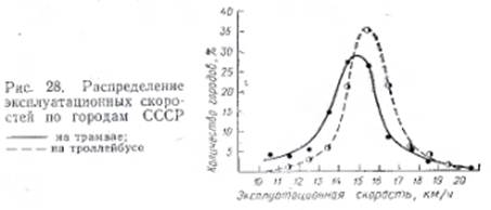 Эксплуатационная скорость зависит от целого ряда факторов. Основными из них являются длина перегона, интенсивность движения, состав транспортных потоков, принятые методы регулирования движения, состояние дорог, динамические качества подвижного состава и его состояние. Из-за различия условий движения в городах и на отдельных маршрутах в каждом городе эксплуатационные скорости колеблются в значительных пределах. По последним статистическим данным, в городах СССР эксплуатационные скорости трамвая колебались от 10,1 до 21,7 км/ч. Троллейбус имеет примерно такие же колебания скоростей — от 11,1 до 24,9 км/ч. Так как условия работы автобусов отличаются от условий работы электротранспорта (использование экспрессных и смежных городских и пригородных маршрутов), пределы колебаний скоростей на них больше, чем на электротранспорте. Средние эксплуатационные скорости городского электротранспорта в городах СССР в последние годы находятся примерно на одном уровне (км/ч); троллейбус 16,5—15,9, трамвай около 15, автобус 17—18. Аналогичное положение наблюдается за рубежом. Колебание эксплуатационных скоростей по видам транспорта объясняется различными условиями их эксплуатации (длина перегонов, положение маршрутов в уличной сети городов) и конструктивными особенностями подвижного состава. Для современных типов подвижного состава (трамвайные вагоны РВЗ-6, Т-2, Т-3 и К-2, троллейбусы ЗИУ-5 и ЗИУ-9, автобусы ЛИАЗ-677, ЛАЗ-698, «Икарус-180» и ПАЗ-672) при одинаковых длинах перегонов 450—550 м эксплуатационные скорости становятся практически одинаковыми и составляют 15—16 км/ч.